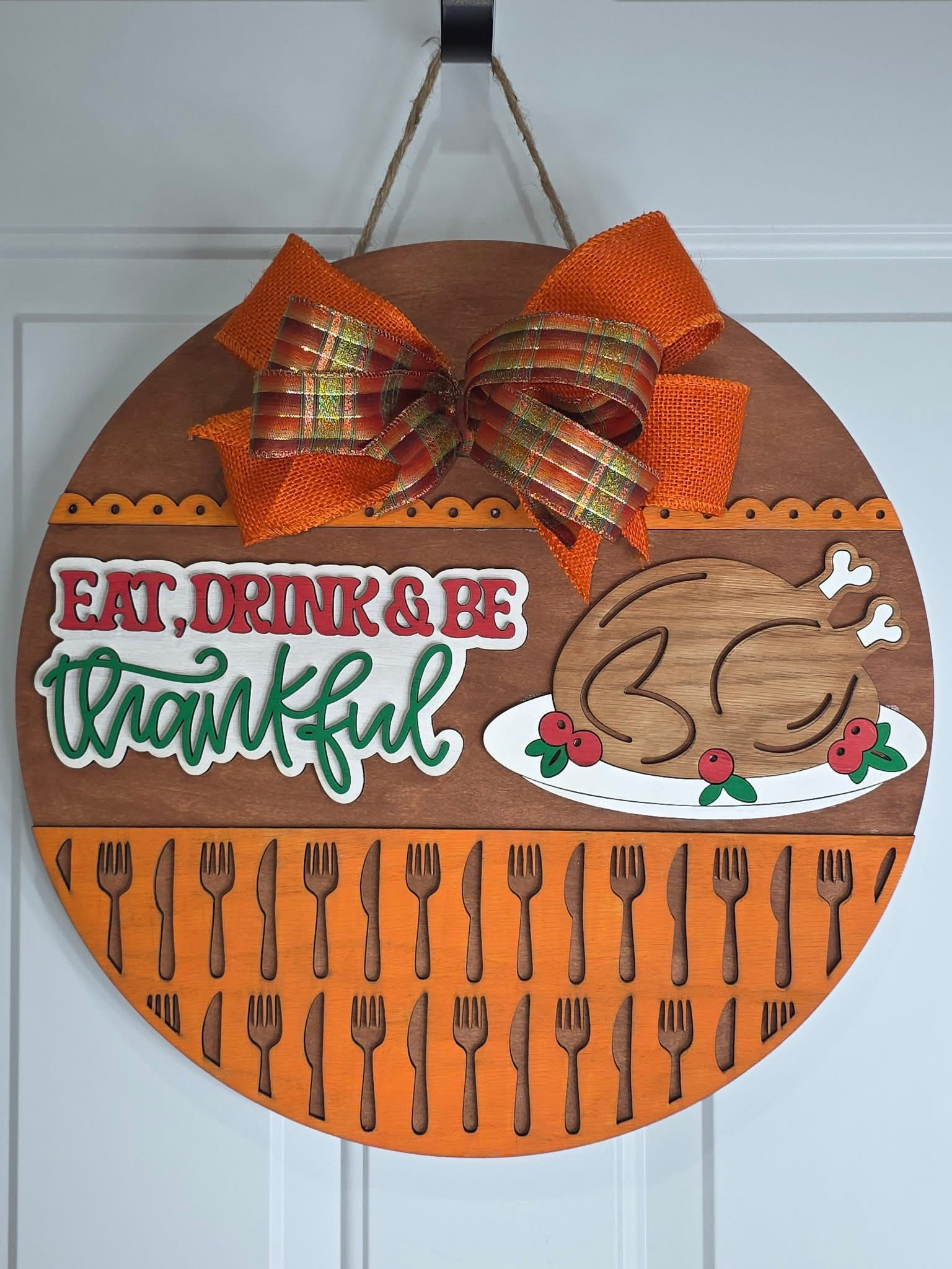 Eat, Drink & Be Thankful Door Sign. Available in 13″, 16″ or 18″. Starting at $25.00