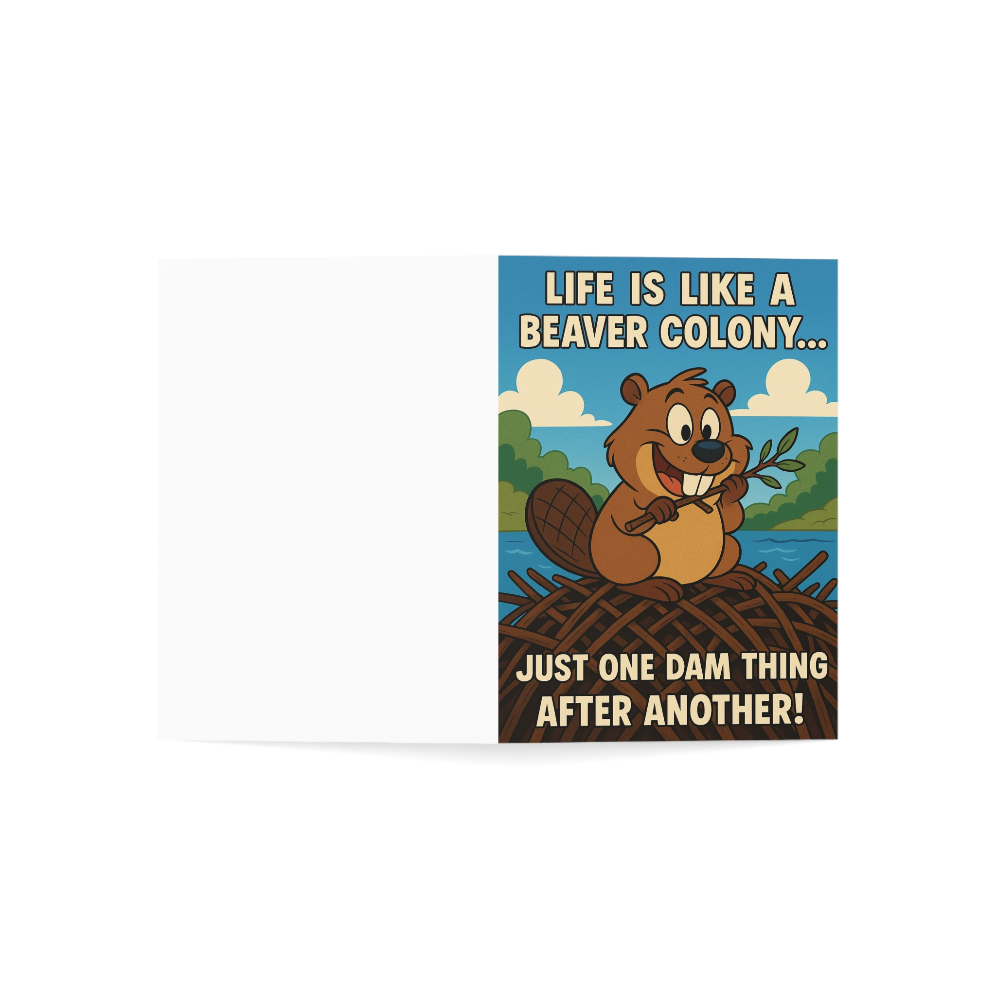 Bright, playful greeting cards that bring a grin and a little woodland wisdom. Each card features a cheerful cartoon beaver and the witty line “Life is like a beaver colony… just one dam thing after another!”—printed in vivid, durable color on sturdy 270gsm white paper. The front overlaps the back for a clean finished edge, and you can choose from uncoated, matte, one-side or two-side coated finishes for a soft or satin look. Blank inside for your own message and paired with a matching envelope, these cards slip easily into everyday moments—sending encouragement, a laugh, or a quick note to someone who appreciates cozy, nature-minded humor.